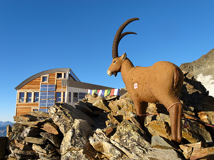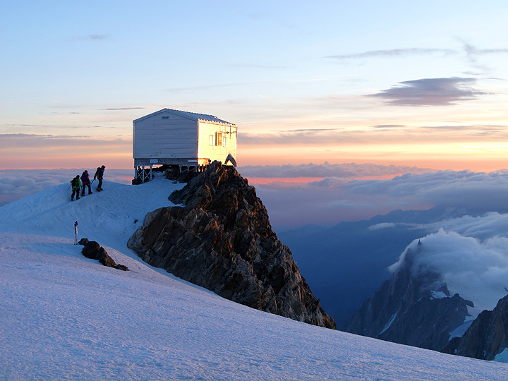 Sunrise greets us at the Vallot emergency bivouac hut, 4350 metes. |