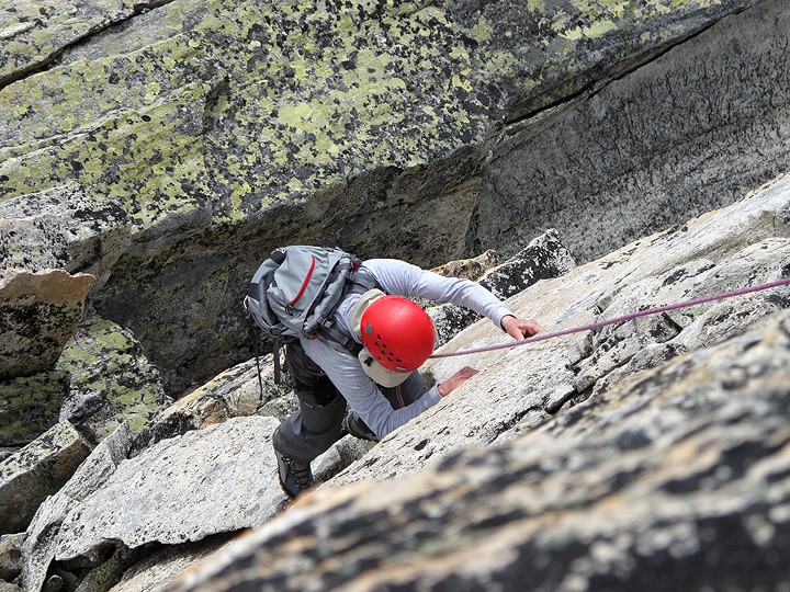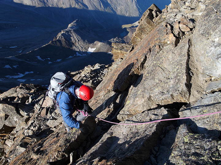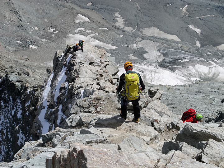 Easy, blocky climbing on the Weissmies South Ridge. |