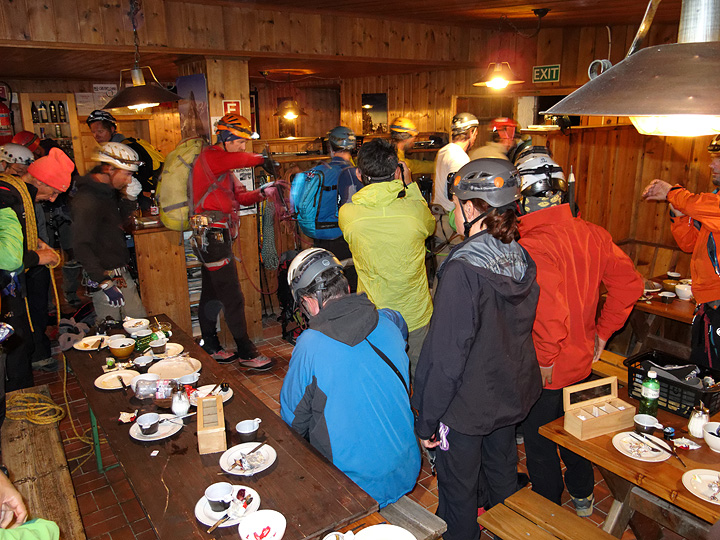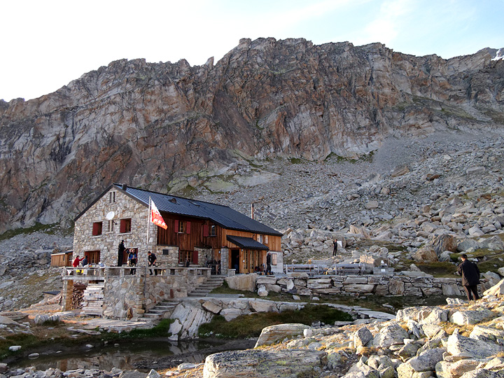 The Almageller hut. On our day 2 we made and enjoyable traverse of the Dri Horlini. The "three horns" is a small peak of lovely rock with a fine and exposed ridge line traverse. In this view it forms the backdrop to the hut. We traversed in a left to right direction. |