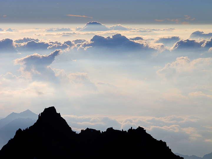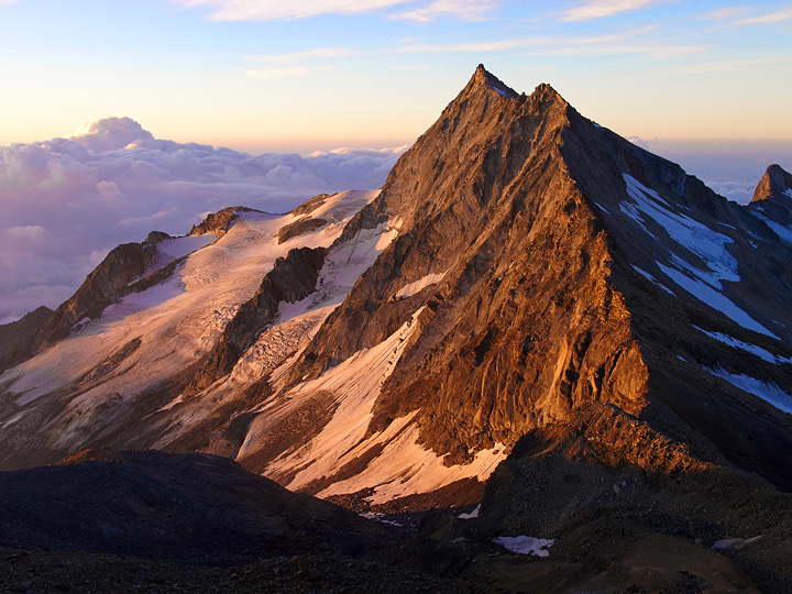 On our third day, we traversed the Weissmies, a massive 4000 meter peak above the Saas valley. At sunrise we had a find view of the Portjengrat. |