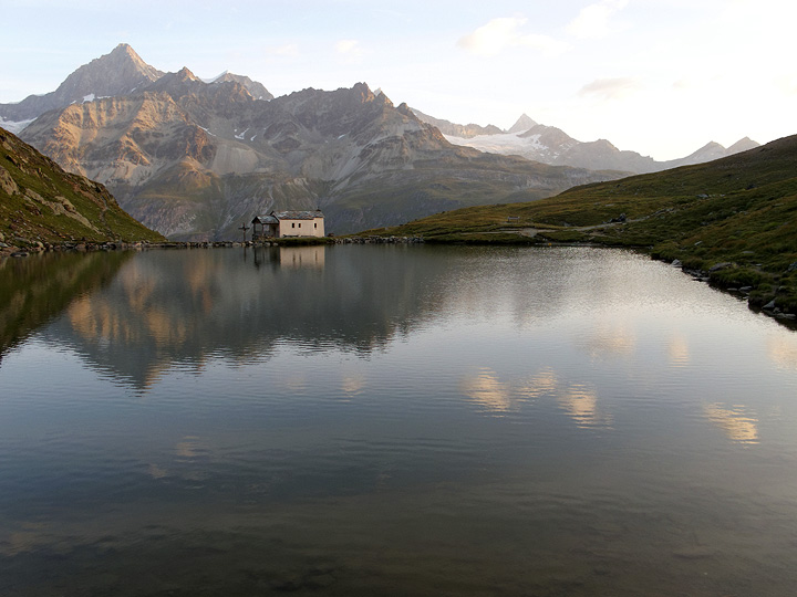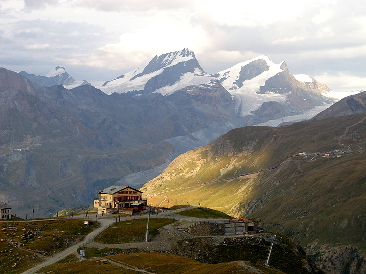 Our hotel at Schwarzsee. The Rimpfischhorn and Strahlhorn in the background. |