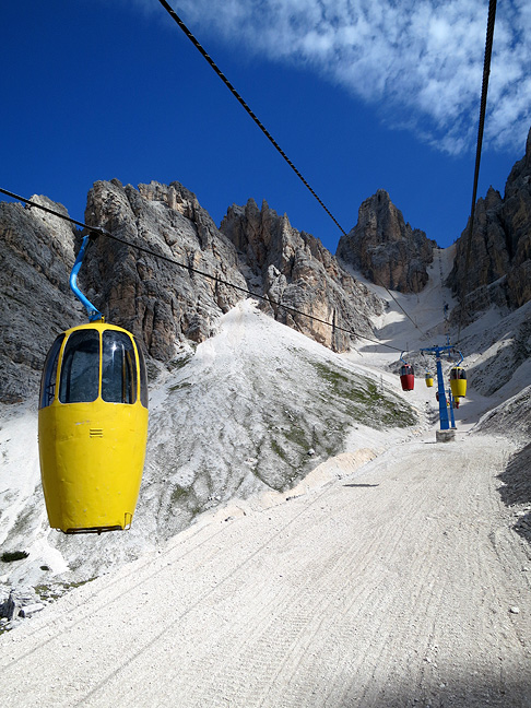 The next day we moved up to the Rifugio Lorenzi, where a night spent at 3000 meters allowed us to do two longer routes without time pressure. Our day began with a long, slow ride on these ... interesting 2-passenger cable cars from waaaaay back. Still running though! |