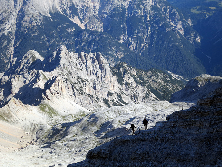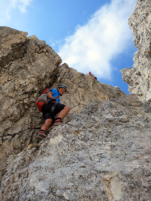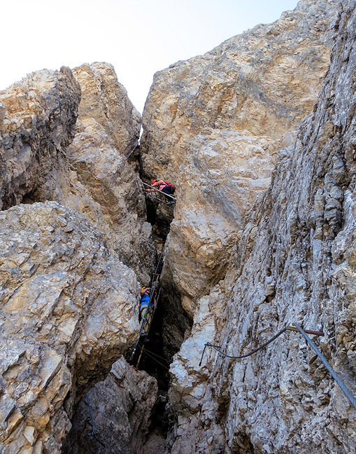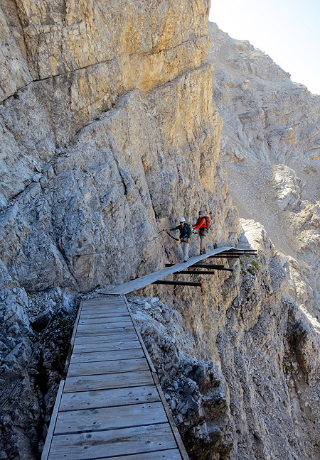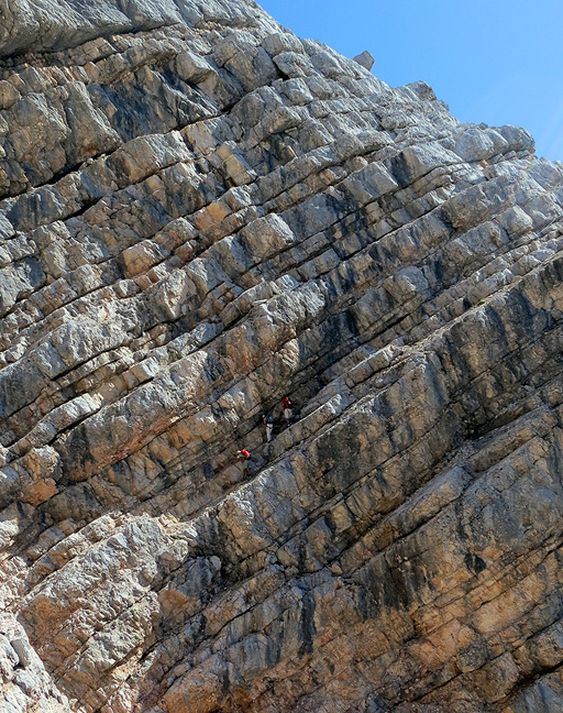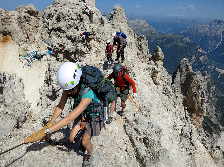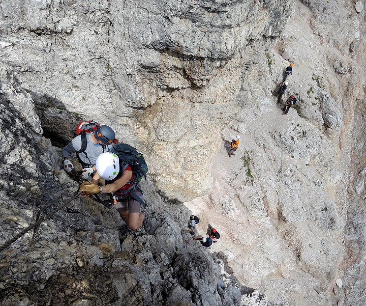 Ferratists traversing exposed ledges below the Vecio del Forame. |