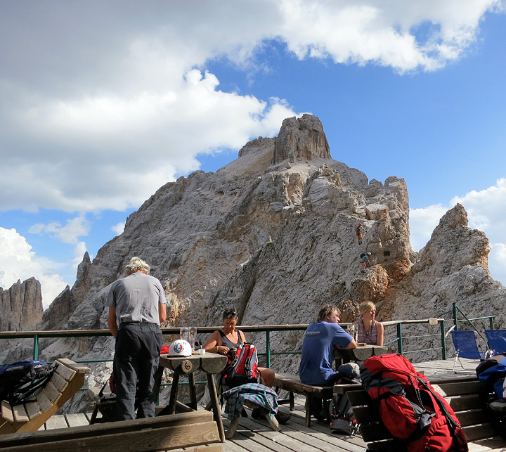 Our first route, Cima di Mezzo, leaves directly from the terrace of the hut. In this shot, ferratists rest after their labors and have a drink before heading back to town, while the last stragglers come down off the peak. |