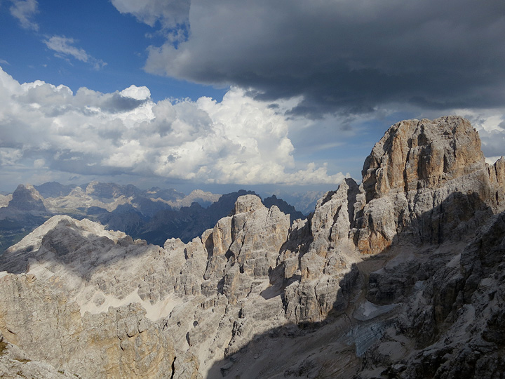Our route on this day is called the Ivano Dibona, descending 1600 m and who knows how many kilometers, to the road at Ospitale. Our hut neighbors skip the Cristallo and continue down the ridge ahead of us. |