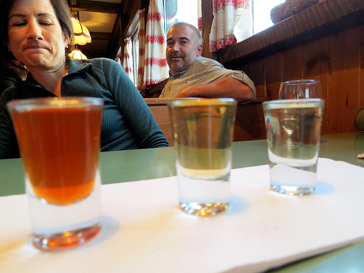 We decided to sample three home-made grappas as a "digestif" after dinner. Lori looks very skeptical, while our neighbor finds it funny and touristic that we are taking pictures rather than just knocking it back. From left to right are cinnamon, pine, and larch flavors. The latter two were... subtle. |