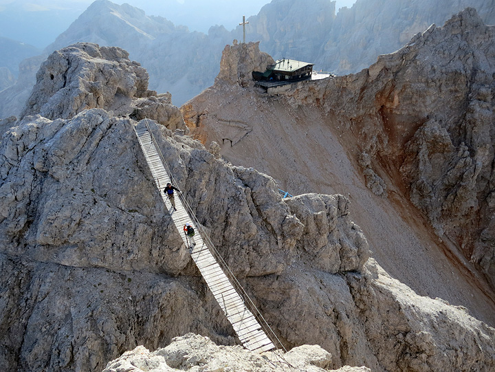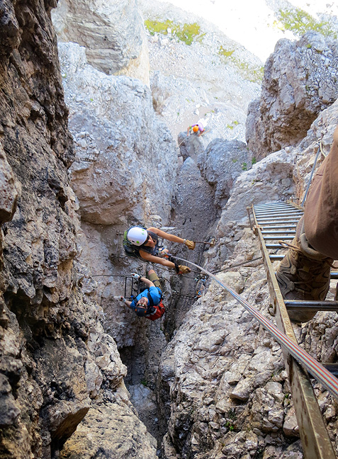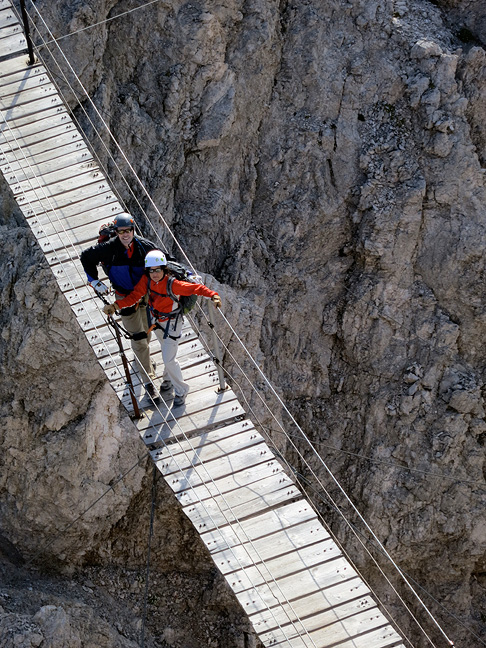 The system of Via Ferrata in the Dolomites has become increasingly developed and popular over the years. Many date back to the first World War, and were built and used by soldiers of both the Austrian and Italian sides in their struggle to control this region. In modern times many more have been added, extended and reinforced for the enjoyment of mountain lovers, so that today there are literally hundreds of these "muscle powered fun rides" throughout the Dolomites. They allow access to remote and exciting situations and summits, while the cables, ladders and occasional bridges facilitate climbing without the need for traditional rock climbing equipment and techniques. |