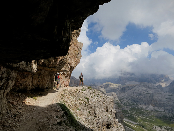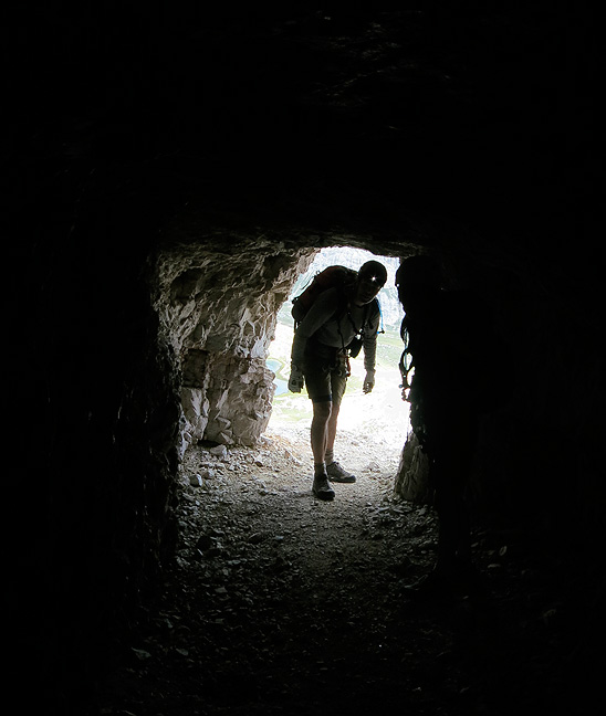 The Innerkofler route on Paterno is famous for, among other things, its 600 meter long tunnel carved steeply into the mountain. A scattering of holes in the wall give some light for part of the way. |