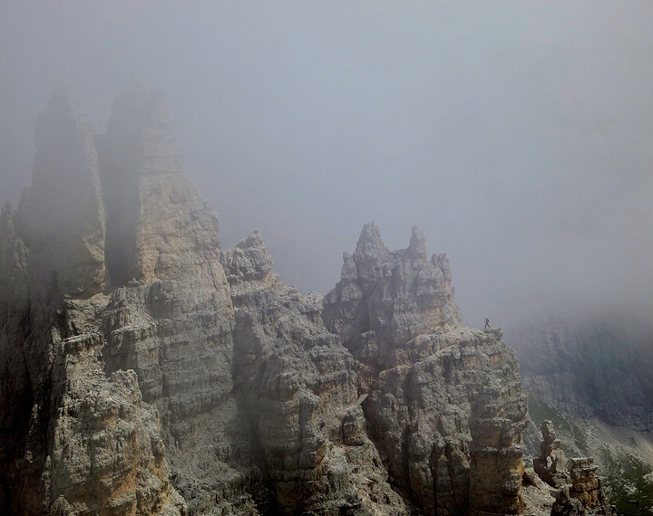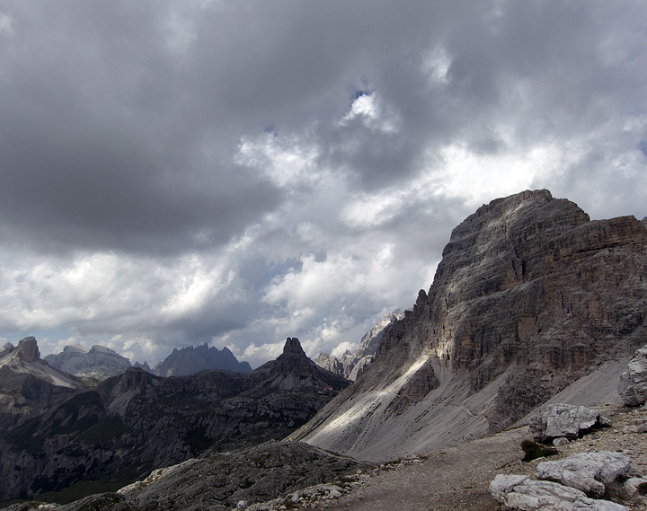 We drove the toll road to its terminus at the Auronzo hut, then walked up into the Tre Cime de Lavaredo playground. The Tre Cime themselves were in and out of mists on this day. |