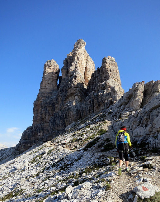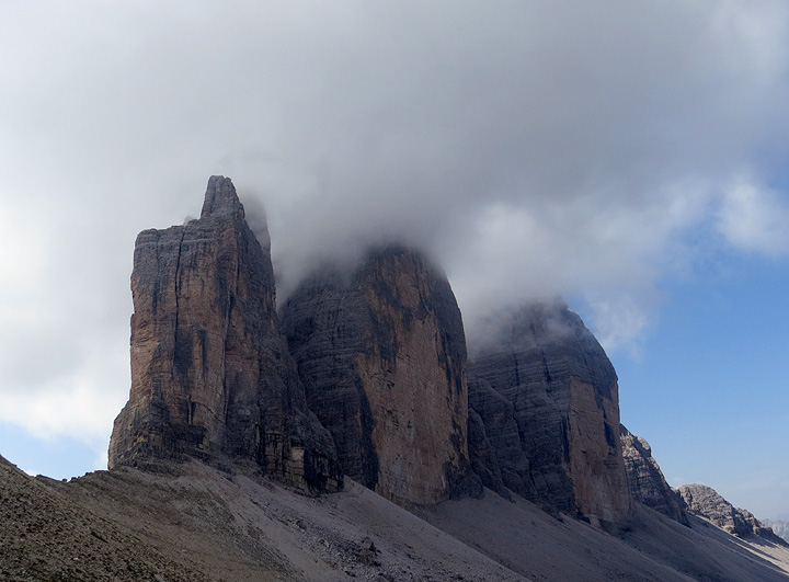 The Tre Cime still flirting with fog as we head back toward the Auronzo hut. |