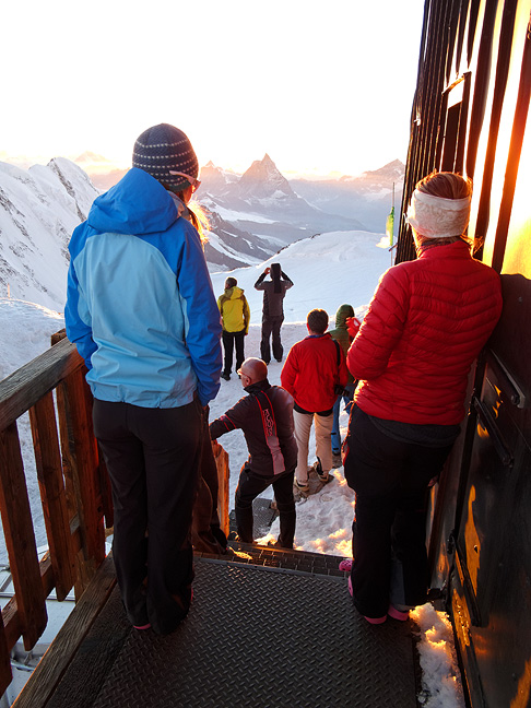 On the summit of the Signalkuppe. And also on the deck of the Margherita hut. Lodgers wait for the sunset. |