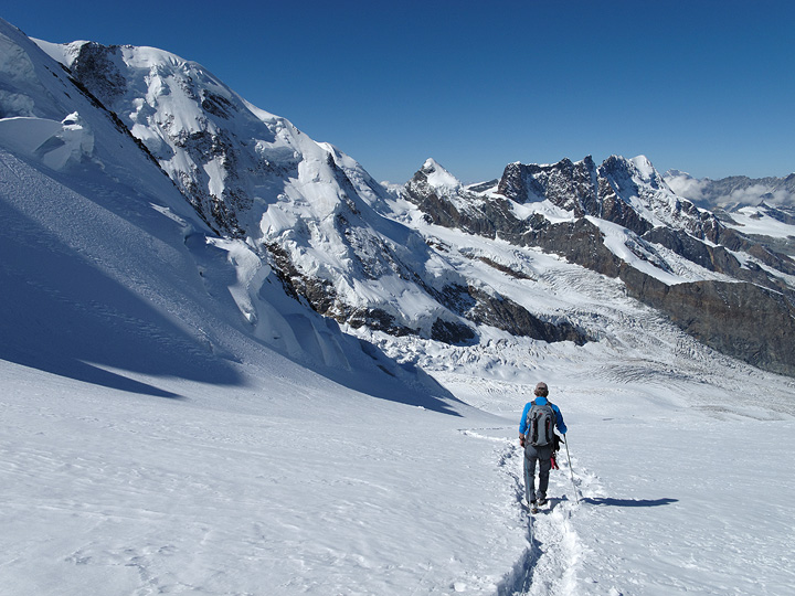 Heading up the Parrotspitze. The Liskamm behind. |