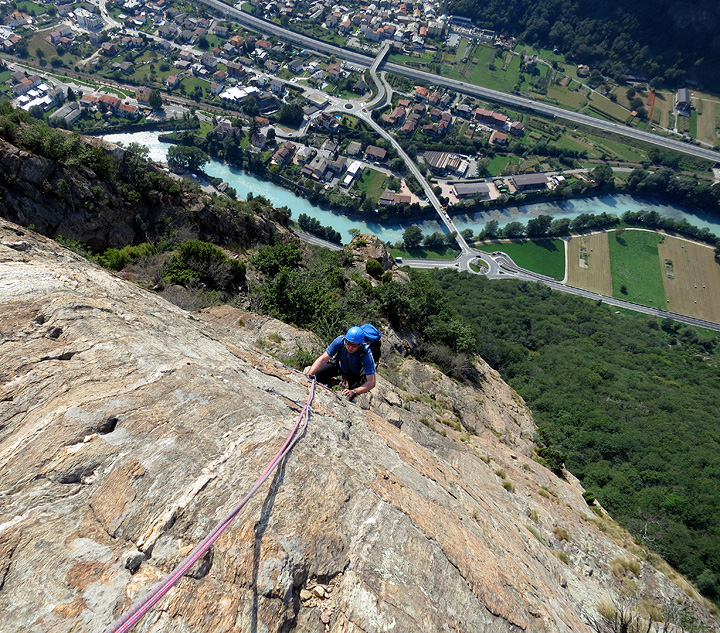 We started out in Italy, rock climbing in the sun. A forecast suggesting an early onset of a very wet storm had Kathy nervous about the high mountains. However, the temperature and weather were perfect here on Dr. Jimmy (Arnad-Bard area). Mark on some thin slabs here selecting the right foothold. |
