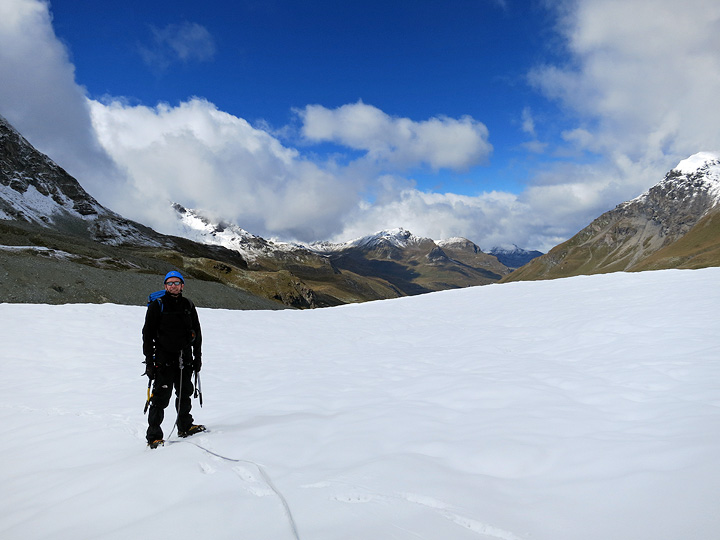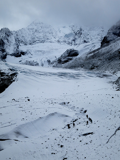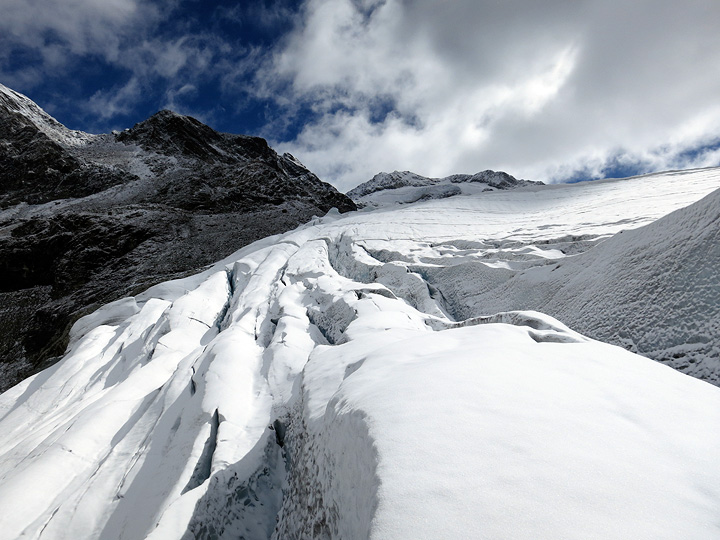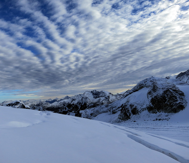 Once up on the glacier, a fairly low ceiling of cloud pulled up over the peaks like a blanket. |