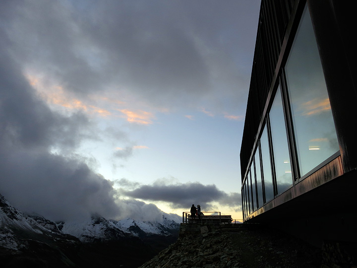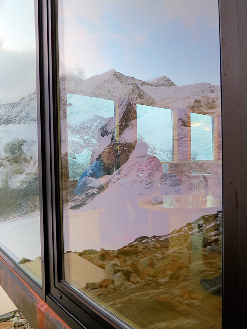 Reflected in the picture windows of the gorgeous Moiry hut dining room, tomorrow's objective, the Pointe Mourti. We can see the top! Good news. |