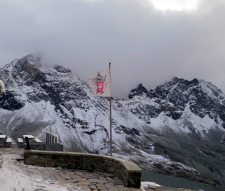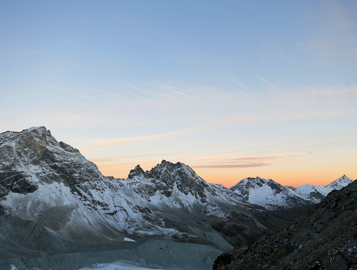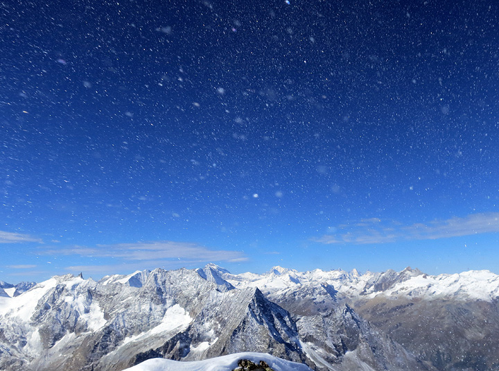 Through blowing snow, the views to the southwest are dominated by the Grand Combin (center left) and Mont Blanc (center right) in the far distance. |