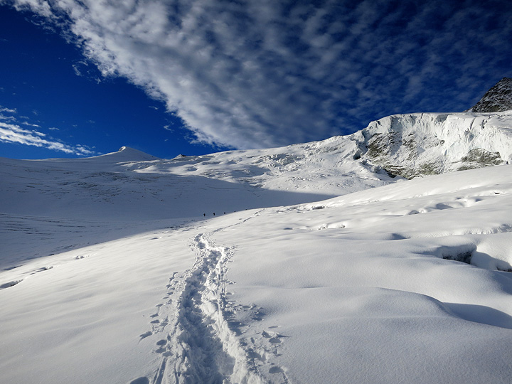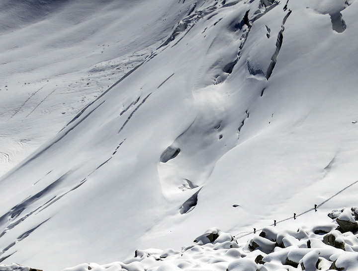 The view up the glacier, another party ahead of us blazing a nice trail. |
