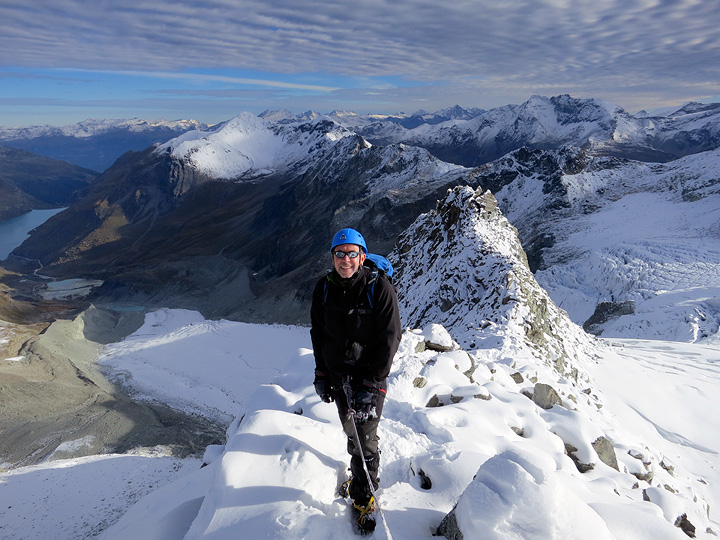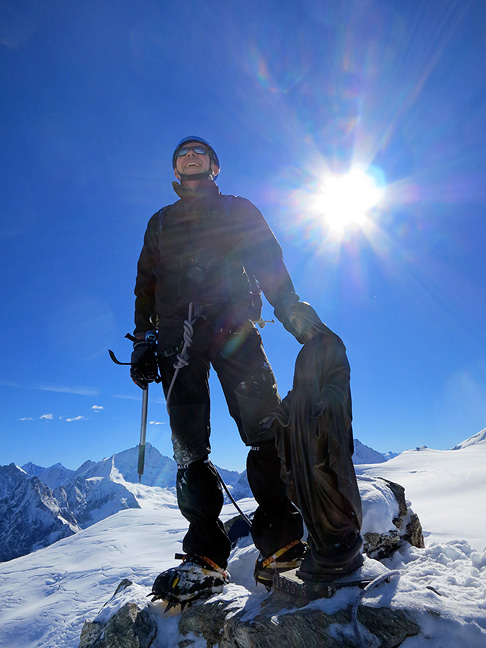 Mark enjoying the truly exceptional views from the summit of Pointe Mourti. The air was as crystal clear as either of us had ever seen it, the surrounding peaks luminous. Under Mark's ice axe: the Weisshorn. |