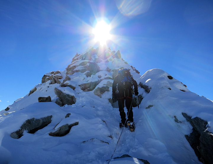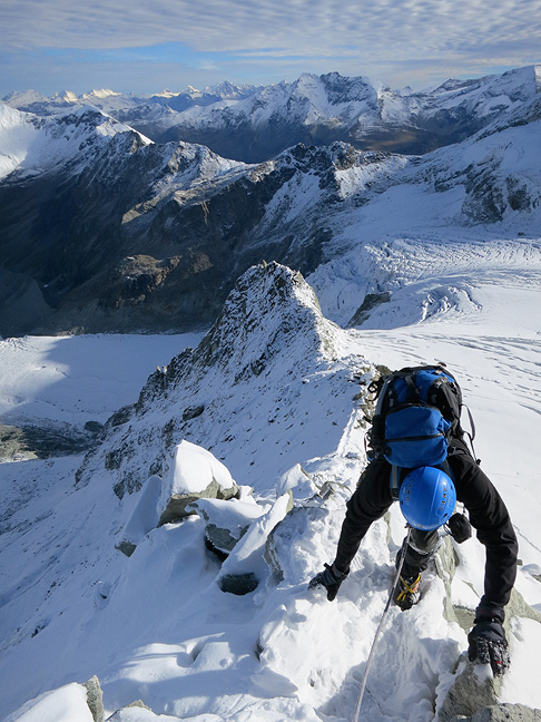 Scrambling along the exposed summit ridge, the copious new snow lends a different, wintry atmosphere. |