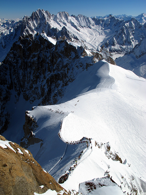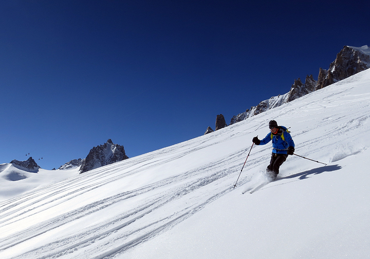 We started the trip, as usual, with a descent of the Vallée Blanche. We benefited from a rare lull in the steady stream of bad weather that has plagued this part of the Alps for over a month. Not this day! What a gift. |
