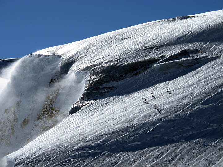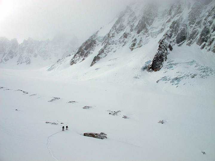 The next morning, this is as clear as the weather got as we began our retreat from the Argentière glacier. The storms were soon back in full bluster. Knowing it would be brutal as well as dangerous to try and push on via multiple steep cols to the Trient hut, we altered our plan to get to the Mont Fort hut and thus stay more or less on our schedule. As it turned out, even the highway over the Col des Montets was closed, temporarily, for avalanche control and clearing. This delayed but did not prevent our progress. |