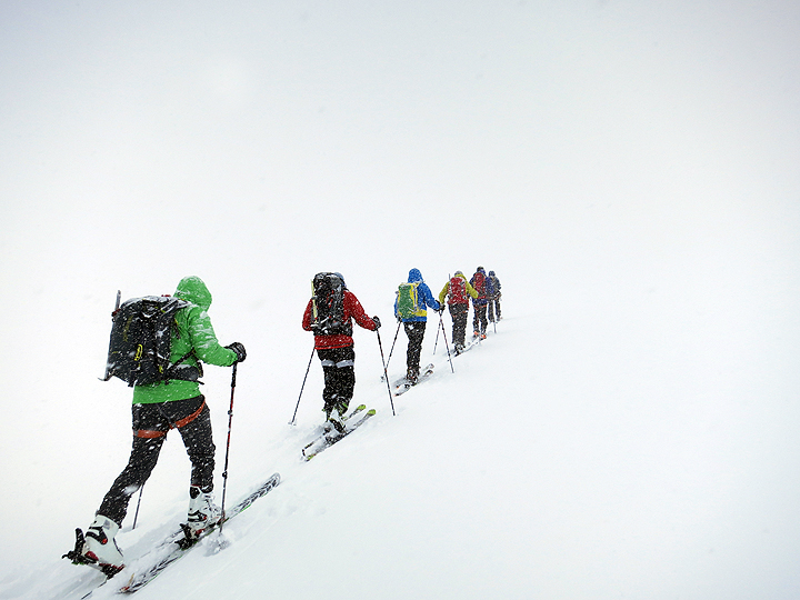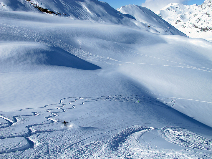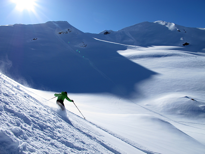 A short afternoon skin up the slopes above the hut for a wee patch o' powder, La Luette in the background. |