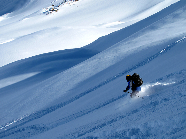 Having just a little more legs for skinning, we were able to find some fresh snow at the margins of this heavily travelled descent. It is Easter week, and the off-piste hordes have been busy the past few days! |