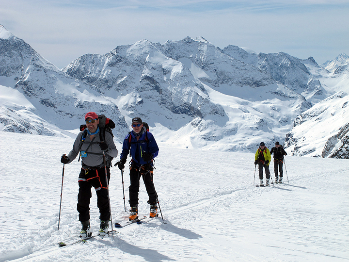 Our improved luck continued into day 6, as we crossed over the high point of the Pigne d'Arolla in blazing clear weather. Here we skin up the Glacier de Tsena Refien, with Mont Blanc de Cheilon in the background. |