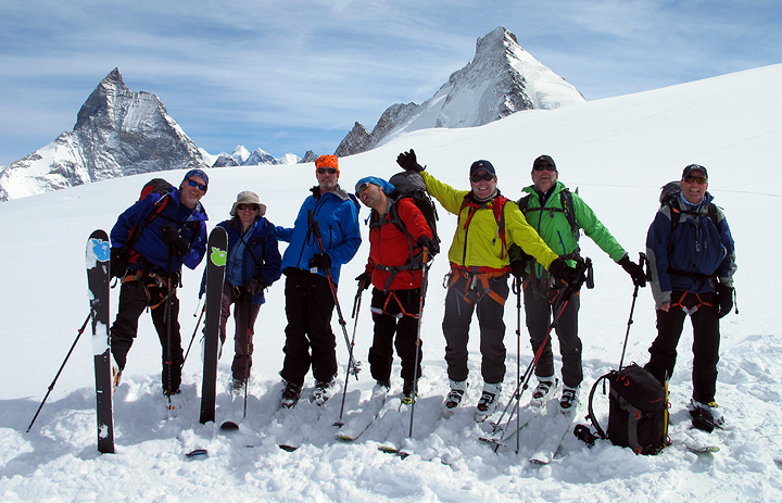 At the high point, everyone feeling lucky to be here in this weather. The Matterhorn peeks over Jamie's left shoulder. |