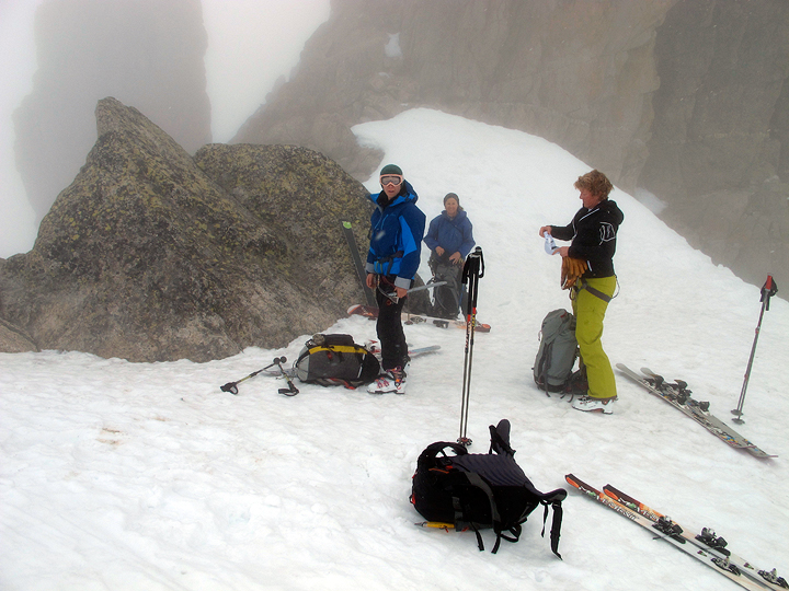 Day three was indeed murky! Here we are topping out on the Col des Ecandies in a damp fog. |