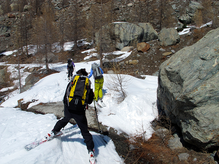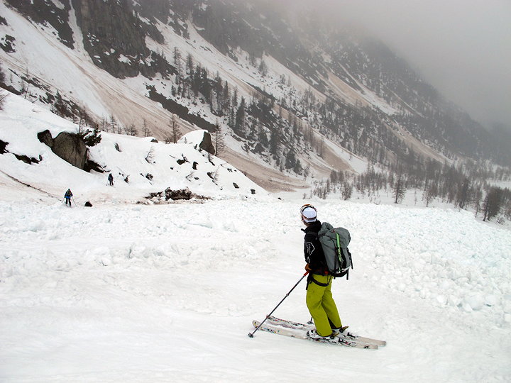 The sudden heat of the previous two days, coming so close on the heels of heavy snowfalls, led to some pretty catastrophic purges in the Val d'Arpette. Although we dealt with very challenging snow conditions, we were just glad to be skiing through the aftermath of these massive slides after things had quieted down, rather than dodging the events themselves as we would have been a few days earlier. Plenty o' debris! |