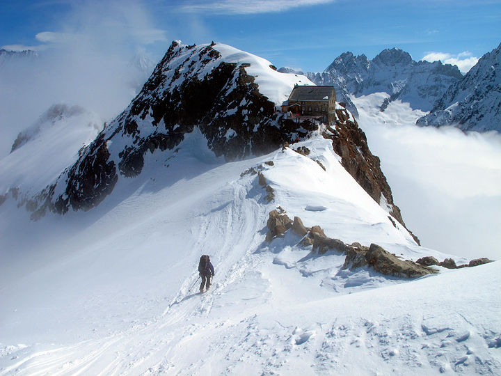After a run down through.... mixed snow conditions to be generous about it, the Vignettes hut comes into view. The Dent Blanche is that massive mountain in the background. |