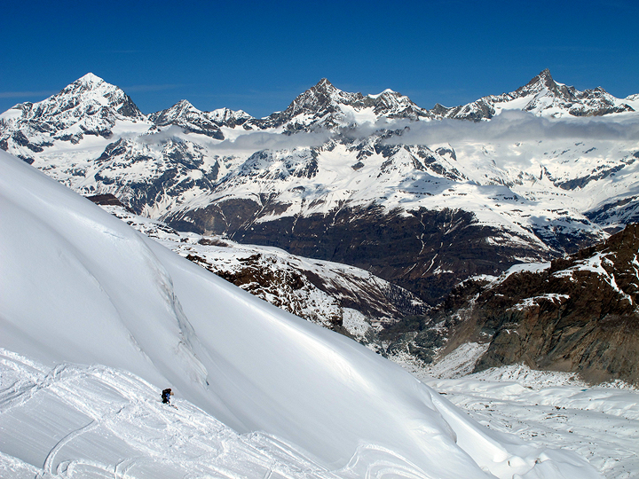 The Dent Blanche, Obergabelhorn, and Zinalrothorn in the background, we go hunting for fresh tracks. |