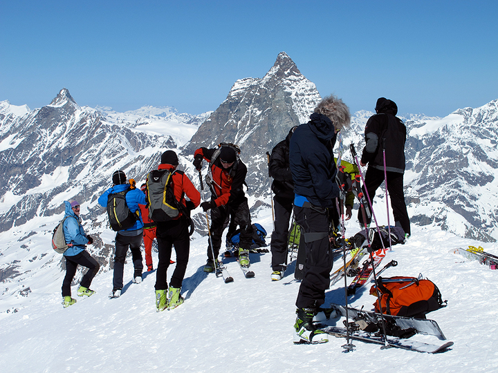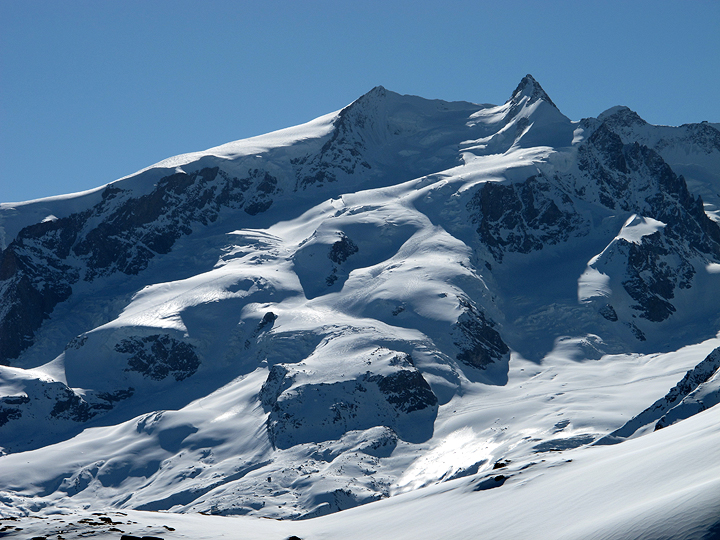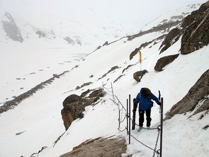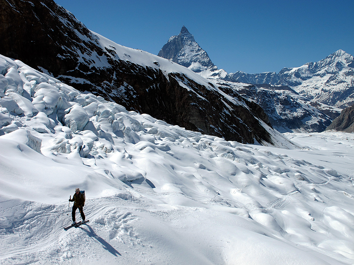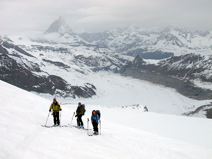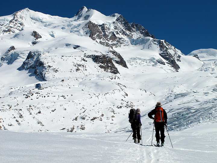 At the bottom of our run, we contemplate the skin up to the Monte Rosa hut, shown in the left of this photo. |