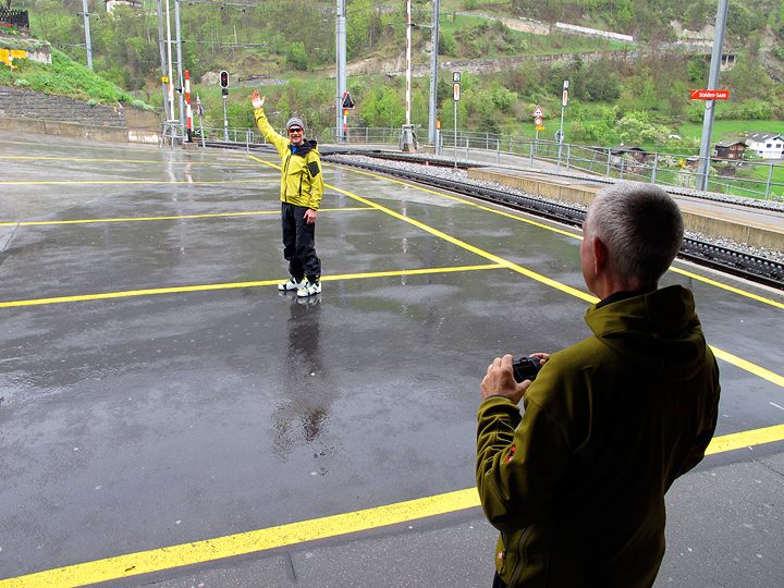 The following day had the worst forecast. We decided to limit our ambitions to getting to the Britannia hut by hook or by crook, and see what the morrow would allow. The rain picked up at the Stalden train station as we awaited the bus. John is not letting it get him down! |