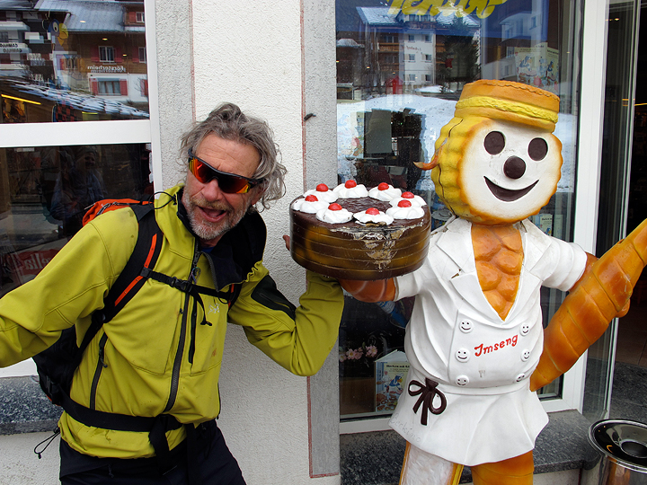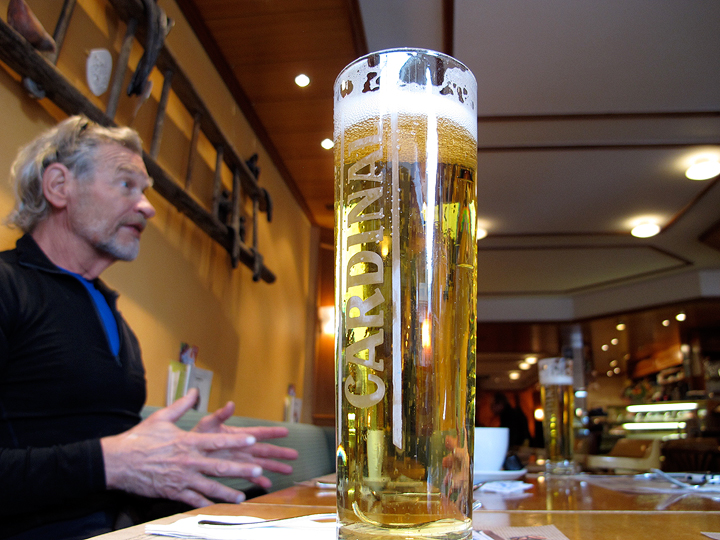 Cooling our heels in a Saas Fee restaurant awaiting the cable car departure, John looks like he ordered a REALLY tall one! |