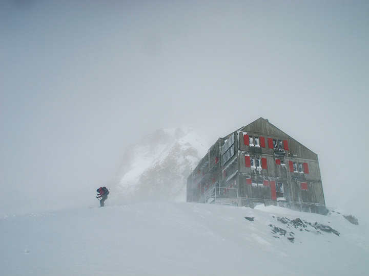 The short journey from the top of the Felskinn lift to the Britannia hut (shown here in reverse the next morning) was so windy and stormy that we didn't even have the heart to get out our cameras, though that would have been amusing. We battled our way to the hut in time for dinner, in the company of exactly four other hopeful souls. |