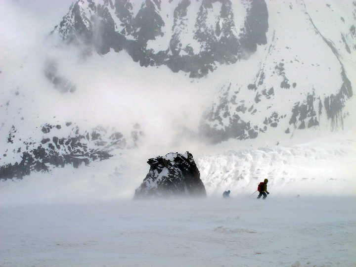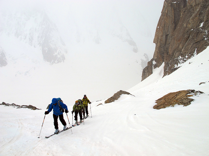 Ultimately we renounced the effort, not only because of the coming weather and deteriorating visibility, but the snow really needed some heat to soften it up. On the descent, we managed to stitch together south facing slopes where the crust held body weight. |