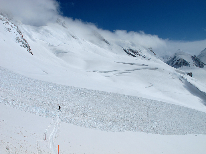Traversing below the south side of the Breithorn we found an impressively large pile of recent avalanche debris. |