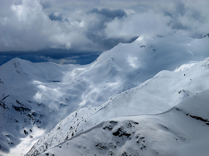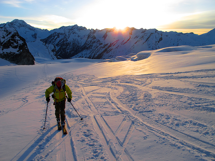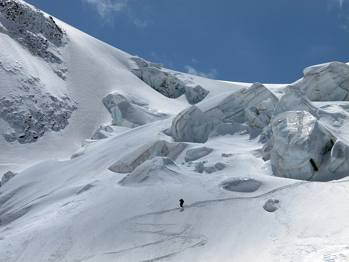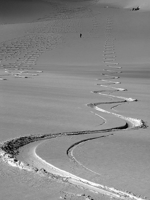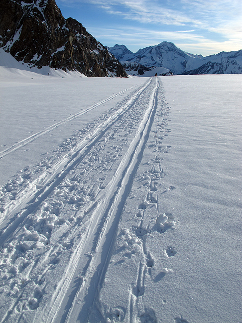With recent fresh, very wind-blown snow, ours were the only tracks down the Schwarztor. |