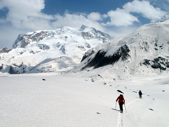 Skiing up the Allalingletscher with the Rimpfischhorn above. |