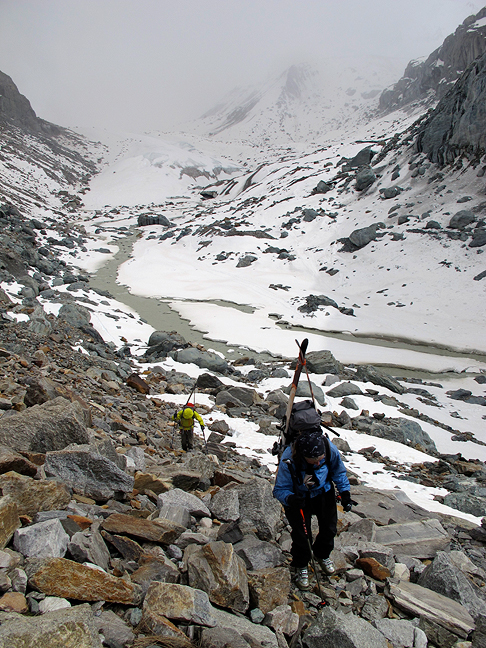 In the very late season, the Schwarztor exit requires some boulder hopping and scrambling to get past the gorge. The weather is chasing us down-valley. |