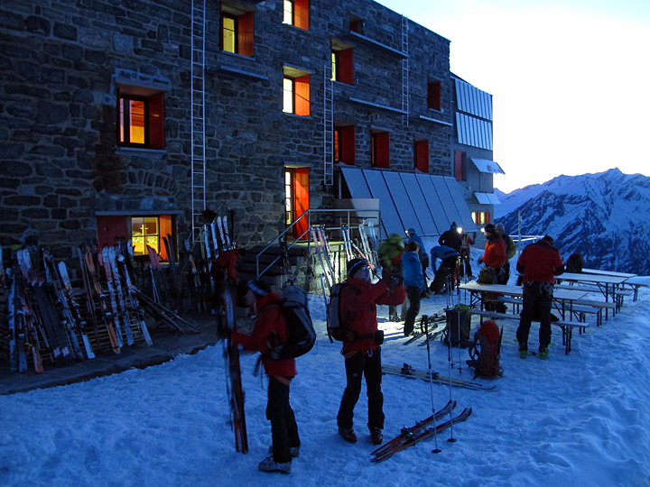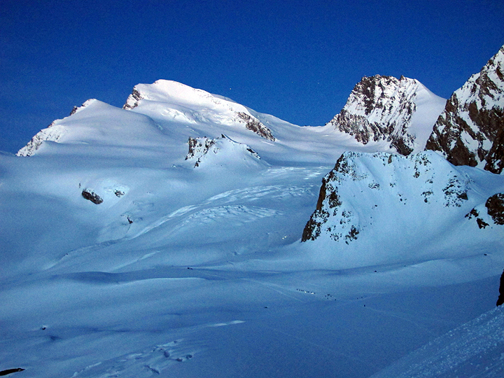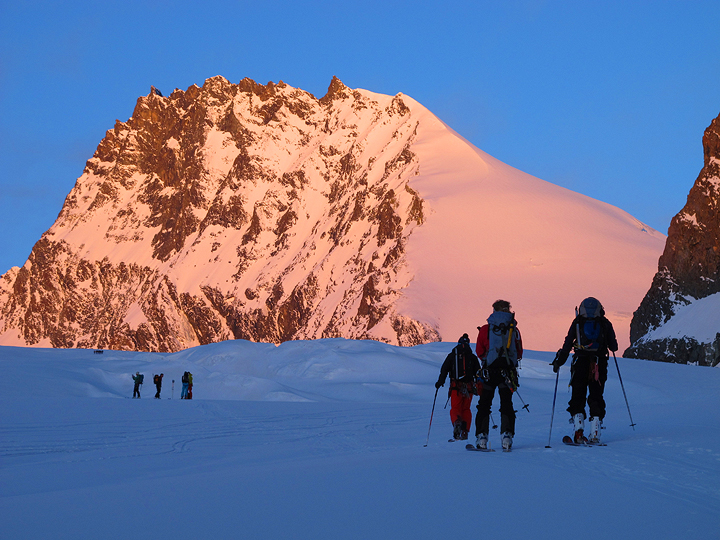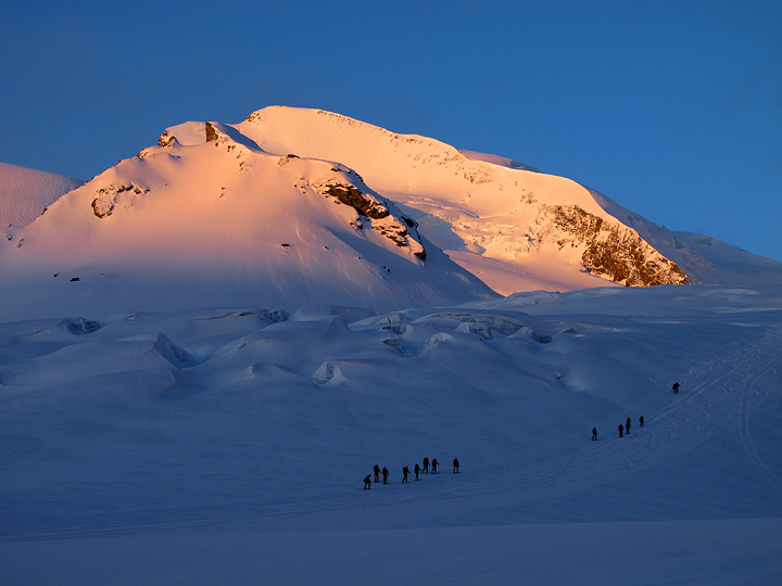 The skies cleared at night and we had a beautiful start to our day. The Strahlhorn is the peak on the left. Down on the glacier you can just make out the head lamps of the early-birds. |