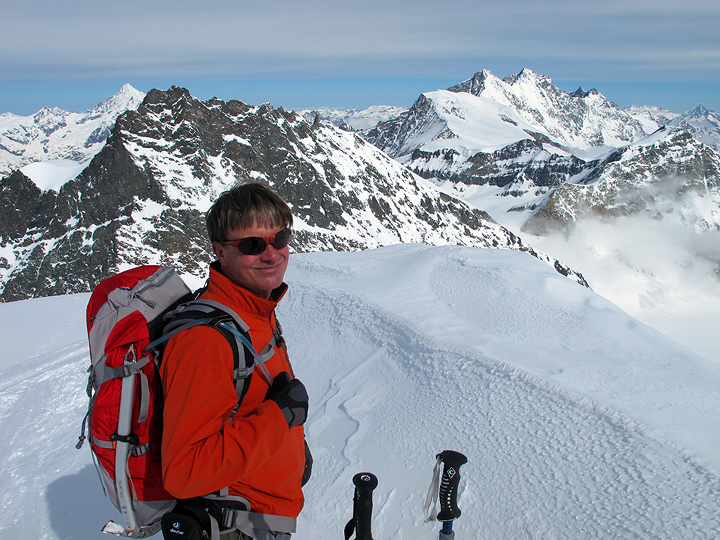 Here's Bill finally enjoying some good snow and sunshine on the descent of the Strahlhorn, our last day. |