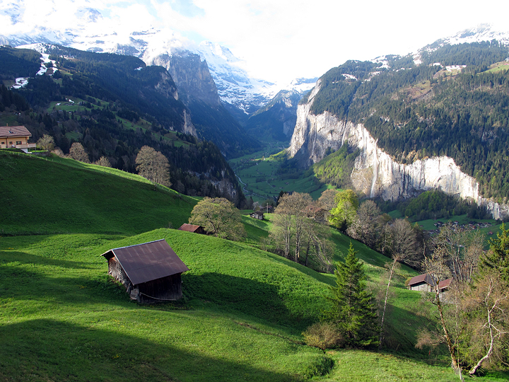 We began as usual by riding the train all the way up to the high glaciers at the Jungfraujoch. Here, we near Wengen, high above the Lauterbrunnen valley. |