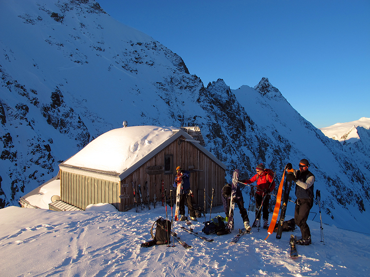 After our first night, at the Hollandia hut, we rose early to a bluebird morning for our ascent of the Äbeni Flue. |