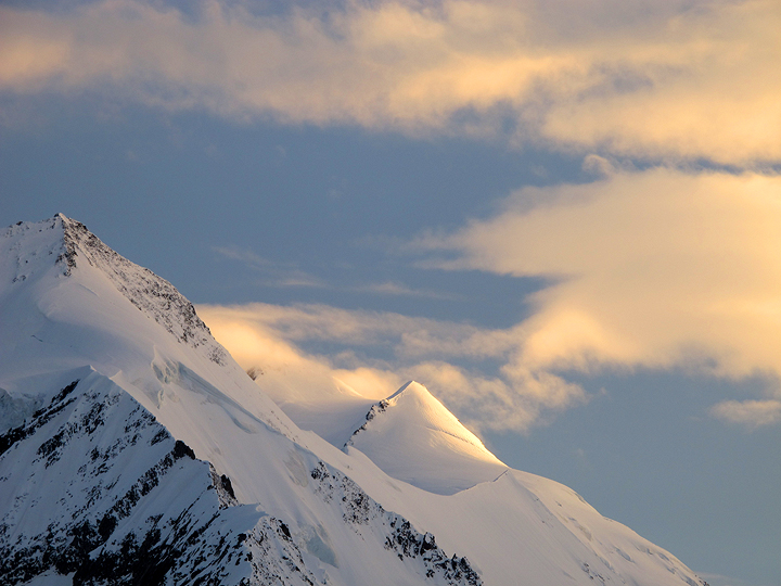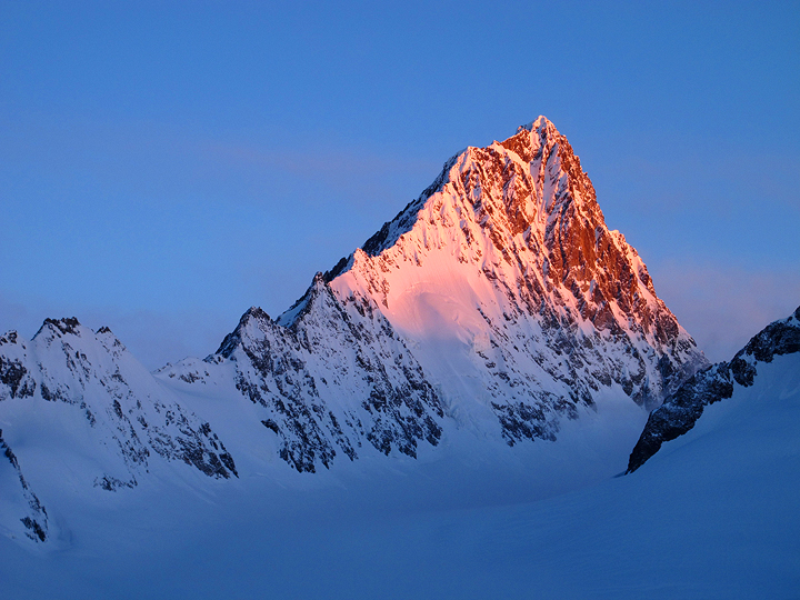 Sunset on the north shoulder of the Aletschhorn as seen later from the terrace of the Konkordia hut. Our first glimpse of the stormy weather to come. |