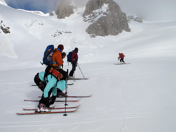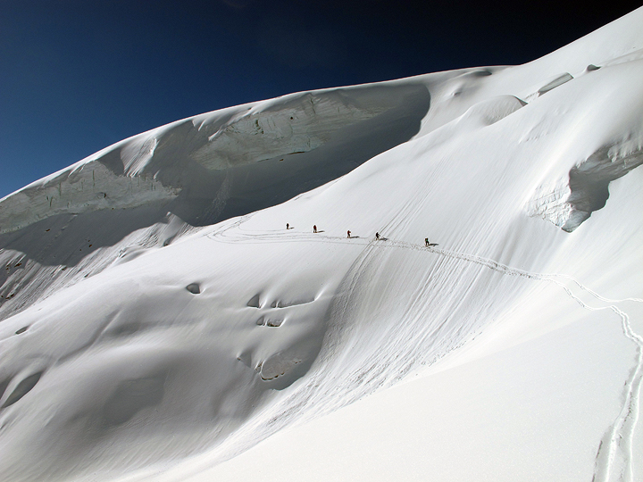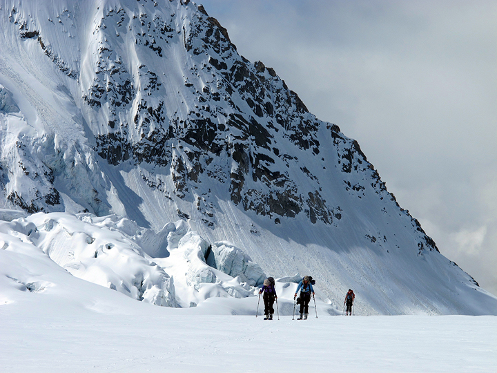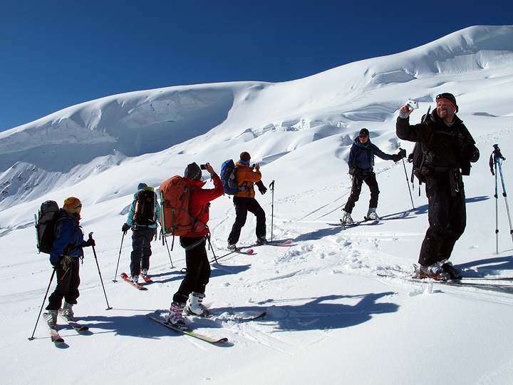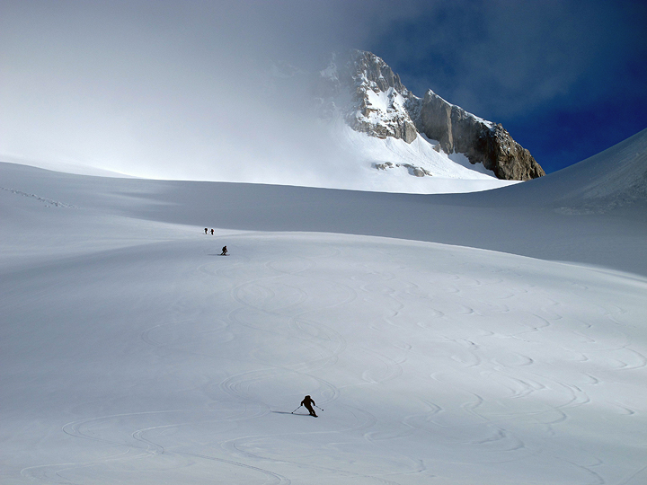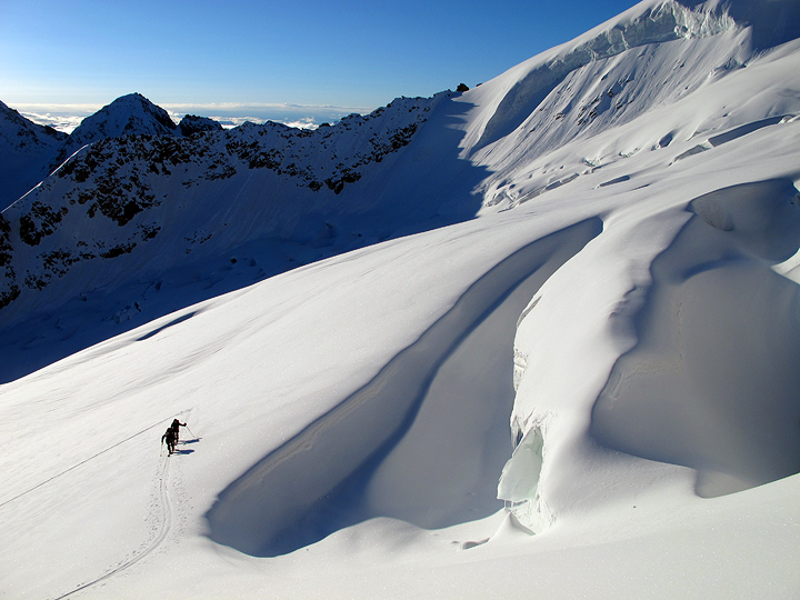 Toward the end of a wild ride through the crevasse fields, hunting out the soft north-facing snow. |