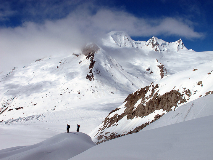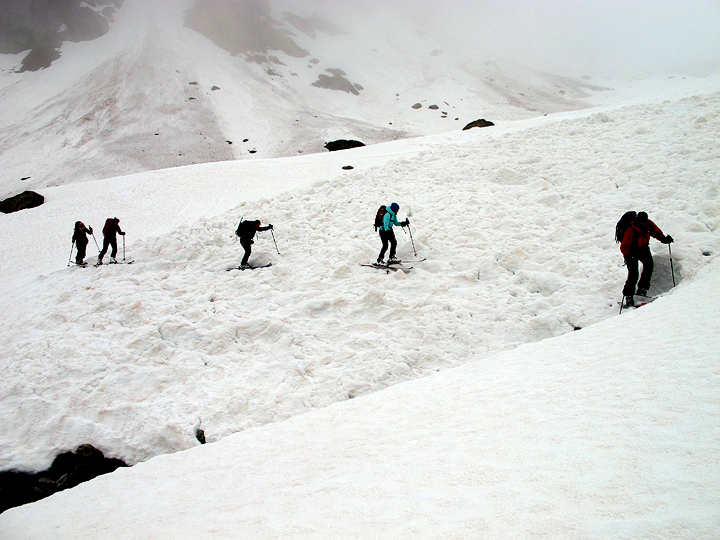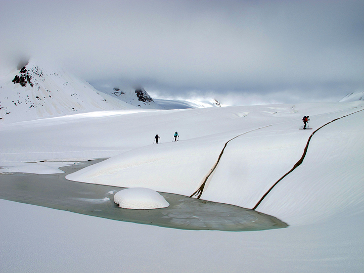 After basking in our glory for a few minutes, it was time to continue our day's journey to the Oberaarjoch hut. Ducking under that cloud ceiling, we negotiate the rapidly melting conditions on the lower Fiesch glacier. |