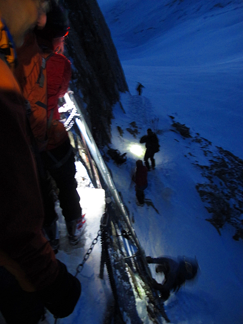Descending the Oberaarjoch hut ladders pre-dawn on our last day. |